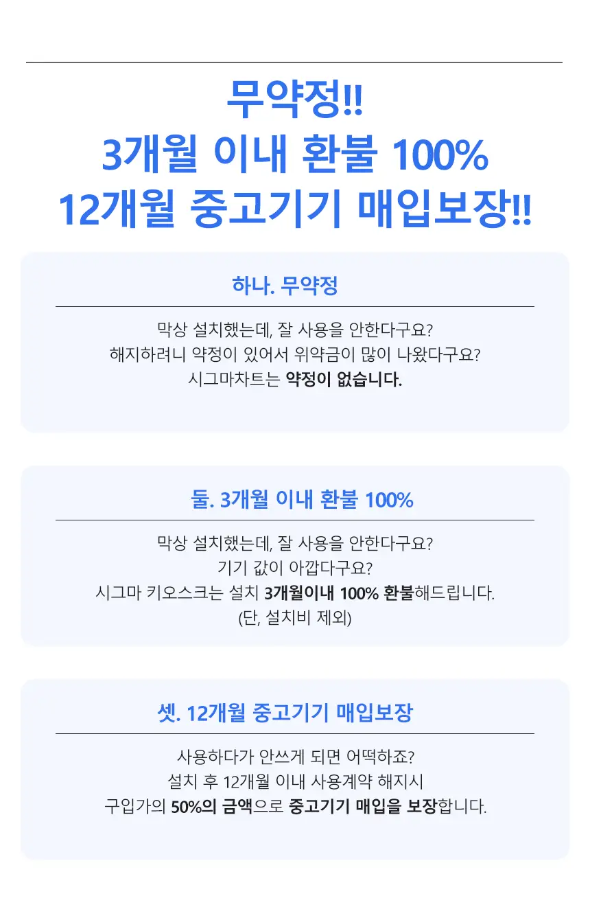 A. 설치후 12개월 이내에 계약을 해지하시는 경우 구입가의 50%의 금액으로 중고기기 매입을 보장합니다.